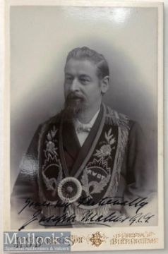 Joseph Malins (1844-1926) English Temperance Activist Signed Cabinet Photograph Vintage signed cabinet photograph of Malins in a half length pose wearing the elaborately embroidered sash of the Right Worthy Grand Templar. Photograph by E. S. Baker & Son of Birmingham and bearing their imprint to the lower mount and verso. Signed by Malins in bold dark fountain pen ink to a light area at the base of the image. Malins emigrated to Philadelphia, USA, with his wife in 1866 and found work as a painter of railway wagons. As a result of his wife's ill health, they returned to Birmingham in 1868. When he returned to England, he brought back the Independent Order of Good Templars (IOGT), a temperance organization which he had joined in the US. The first English lodge was called Columbia No. 1 in Morton's Chapel, Cregoe Street, Birmingham, founded on 8 September 1868. He became president of the English Good Templars, though sometimes called despotic. From 1876 to 1887, the English and Irish Good Templars were in conflict with the Good Templars in America, as in 1875 the American body had adopted a policy of accepting de facto racial segregation of lodges in the American South after the American Civil War. For the reunion of the American and English lodges in 1887, Malins compromised by accepting segregation, but Malins and the Good Templars were uncompromising over temperance and regarded as extreme in England. Malins was in favour of Local Option votes for local areas, which could vote to go "dry". He opposed compensation for liquor licence owners and public management of retail liquor outlets. Malins supported the Liberal Party, but went from supporting the Liberal Unionists to supporting the Home Rule (for Ireland) Liberals. His support for candidates depended on their attitude to temperance. He died at home in Birmingham on 5 January 1926 and was buried in the Yardley Cemetery