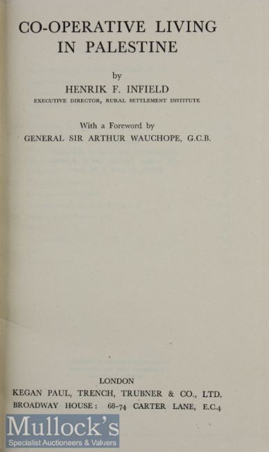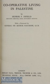 Co-Operative Living In Palestine by Henry F Infield. 1946 Book An interesting 145 page book with 11 photographs. Detailing the Jewish agricultural settlements, development education, defense etc. In cloth board cover, size 5¾” × 8¾”.
