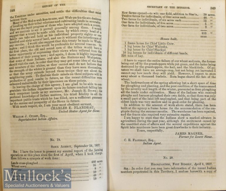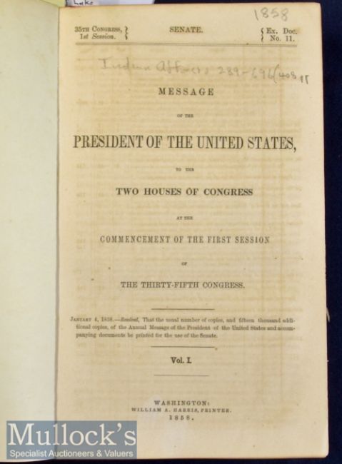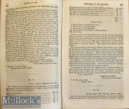 Americana – Indian Affairs – Report of the Secretary on the Interior 1857 which includes Land Office, 211pp Indian affairs 408pp, includes reports and correspondence relating to the Spirit Lake Massacre in Iowa, 54pp, in marbled wraps