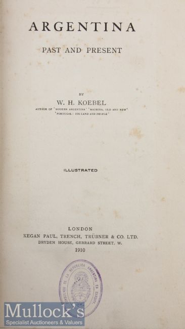 Argentina - Past And Present by W.H. Koebel 1910 Book an extensive 450 page book with over 80 photographs and fold out map. Giving a lot of information about Buenos Aires and other important cities, the Campo, Bahia Blanca, Eastern Pastures, Entre Rios, travel through the Andes mountains, etc etc. In cloth board cover, size 6¾” x 10¼”.