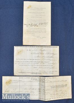 United Kingdom Electoral History / Stamp Notice of Claim for vote in the 1868 election by John Taylor, Booth Hall, Blackly near Manchester with objection to claim postally sent with 3d Rose (1865-67) stamp of cover and a notice of attendance at meeting to substantiate claim, previously pinned together and folded (3)