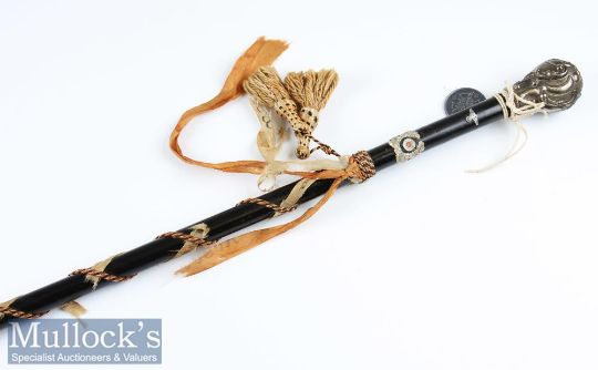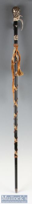 Scarce Third Reich Wehrmacht Officers Reservists Walking Cane having ebonised wood body with ornate cast top, bound with typical ribbons / tassels having a representation of the Wehrmacht cap insignia, together with an attached non-issued 1939/40 campaign medal. Overall length 90cm