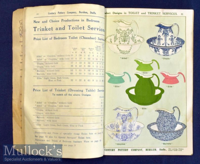 Century Pottery Co, Burslem, Staffordshire. Circa 1910 Sales Catalogue A 46 page Catalogue of which 12 pages are multicoloured illustrating & detailing their various dinner. Breakfast, tea services, other china items, details, prices. In card cover, size 5½” ´ 8¾”.