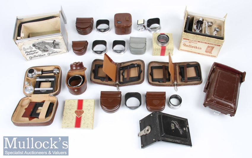 Selection of Rollei Camera Accessories to include Rolleikin conversion kit, Rolleiflex Rolleicord 6x6 platten Adapter, Rolleipar fur Proxar 2 no 941308, Heidosmat-Rolleinor 2, various lens hoods, Rolleilux for the Rolleicord cameras and Rolleiflex 4x4, Rolleikin conversion kit / adapter in case with various boxes and cases for lenses/lens hoods etc (Qty)