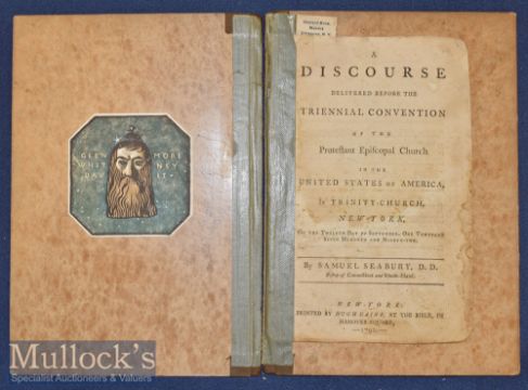 USA – A Discourse Delivered Before the Triennial Convention by Samuel Seabury D.D printed by Hugh Gaine, New York 1792, foxed and scuffed in later hard covers with coloured bookplate for Glenmore-Whitney Davis, circa 1916, cover parted