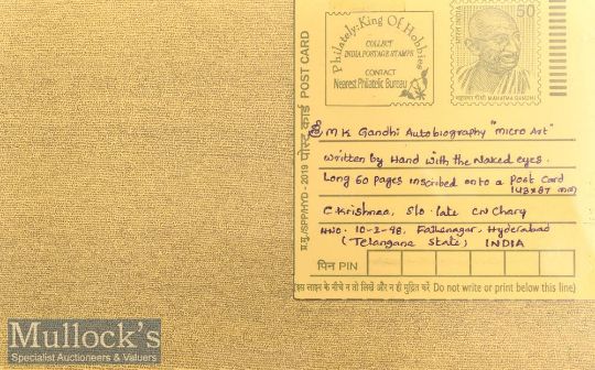 India - MK Gandhi Autobiography ‘Micro Art’ written by hand with the naked eye, inscribed onto a postcard, the complete autobiography, all 140 pages, postcard measures 143x87mm appro
