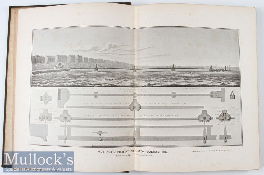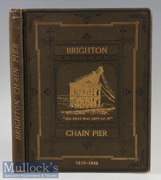‘The Brighton Chain Pier’ in Memoriam. It’s History from 1823 to 1896 by John George Bishop 1897 Book Double page frontis: Chain Pier January 1825., [viii] 74pp + xxv, Complete with all plates and illustrations . Privately published by Bishop, a local author (A Peep into the Past- Brighton in the Olden Time etc) at the request of friends as a memorial of the Chain Pier destroyed in a storm on 4th December 1896. In cloth board covers with gold tooled illustration of what was left of the Pier after the Storm; Size 9” × 11¼”. PLEASE NOTE BOOK IS NOT SIGNED