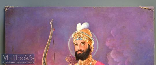 HUS Ratton ‘Guru Gobind Singh Ji’ Oil on Canvas slight damaged to top corners, measures 68x95cm approx. signed to bottom left by artist, ready to frame