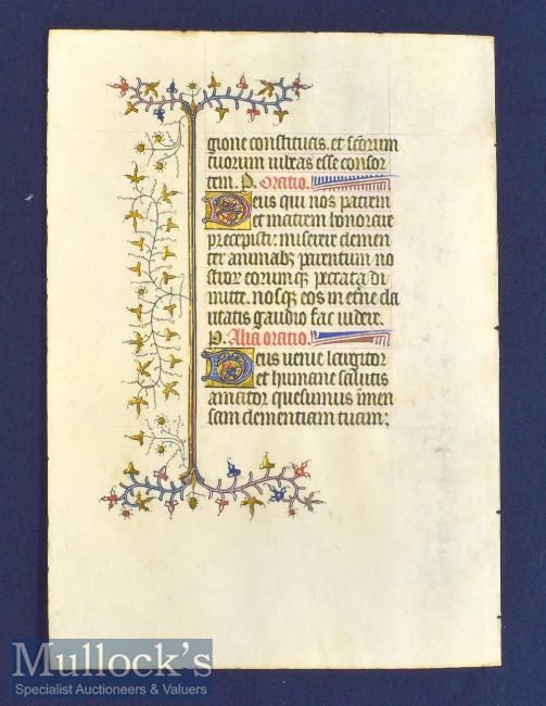 Northern France - A Most Beautiful Early Liturgical Leaf From A Book Of Hours. Circa 1370s Scripted in Northern France. Text in 15 lines in the Gothic-Batarde of this period with initial letters in Blue (Lapis Lazare), red and gold. Also on the Vellum are Branches with leaves in tempera colours and gold. An unusual rich early item of the highest quality, size 5¼” × 7¼”