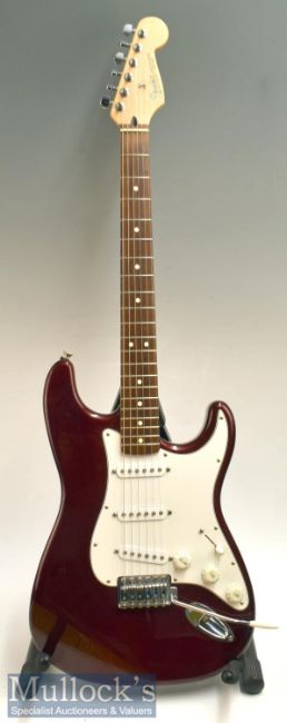1998/99 Fender Stratocaster Electric Guitar Serial Number MN8289350 Made in Mexico in red and white, with leather strap, in gator carry case, with electrics working and comes with a stand