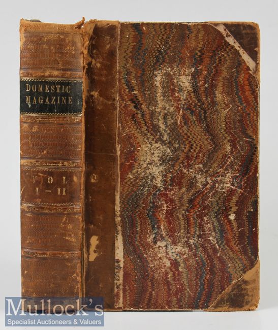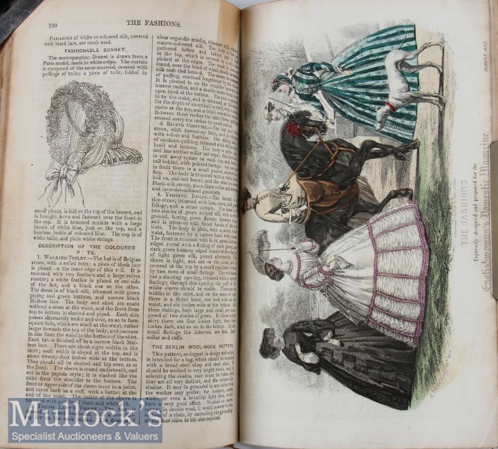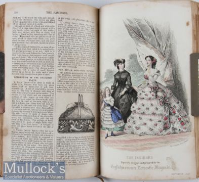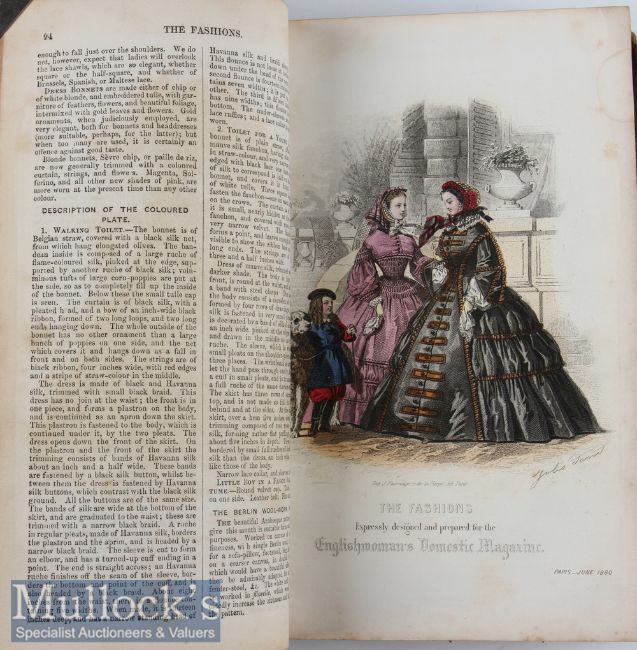 1860/1861 The Englishwoman’s Domestic Magazine - An Illustrated Journal Combining Practical Information, Instruction and Amusement. By Isabella Beeton Volume 1 & 2 in one binding has 288 and 336 pages has With 13 Hand Coloured Engraved Fashion Plates and two Folding Plates and Many B/W illustrations throughout text. Contemporary Half Calf binding. Five raised bands to the spine, size 5½” × 8½” and 1¾” thick. (In 1856 Samuel Beeton persuaded his wife, Isabella, to be a joint editor with him in a new publishing venture, a monthly paper called The Englishwoman's Domestic Magazine. Initially priced at 2d, this was the first cheap magazine for young middle-class women, and it was an immediate success, with circulation of 50,000 copies by 1856. Isabella wrote domestic material, embroidery patterns, cooking, and dressmaking from 1855 until her early death in 1865. The contents also included a range of serial fiction, biographical sketches, gardening and medical tips and correspondence page. There was always a strong emphasis on practical instruction and useful knowledge. In May 1860 the price increased, the Beetons directed their journal to a wealthier more fashionable readership. Included were coloured plates, more emphasis on fiction and fashion, wear to spine, fragile boards