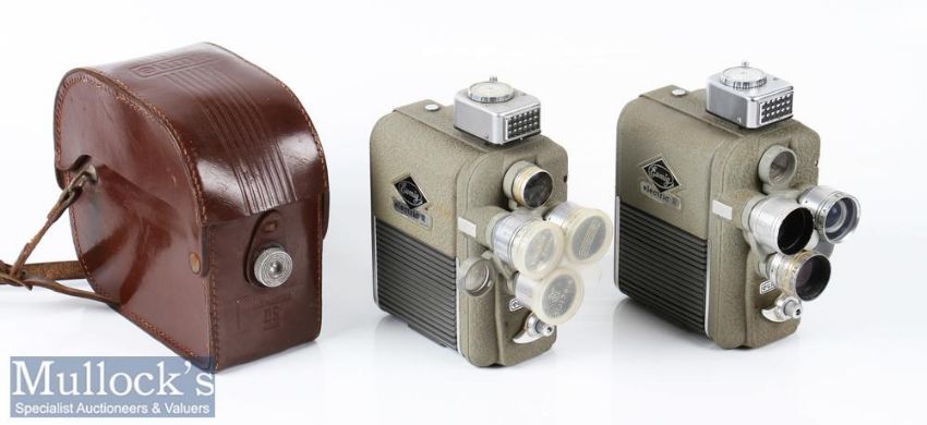 2x Eumig Electric R Treble Turrett cine cameras 8mm one with leather case, plus one plastic lens cap, signs of age related wear, battery operated