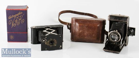 Kodak Autographic Ball Bearing Shutter folding camera No A-127 to reverse with original box together with a Dolly folding camera with F. Deckel shutter, Trioplan 1:3.5 f=75mm with leather case (2)