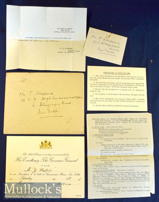 India - Invitation By His Excellency The Governor-General (Lord Louis Mountbatten) To An Investiture At Government House, New Delhi 6th March 1948 Black printing on card with manuscript annotation and Royal Coat of Arms in gold and embossed, size 7 ¾ ´ 6”. Plus pertaining paperwork and envelopes (6)