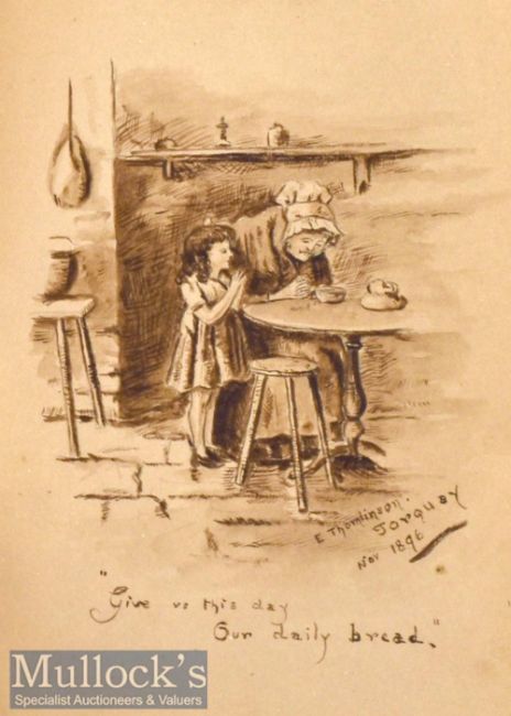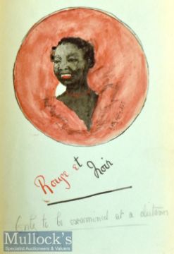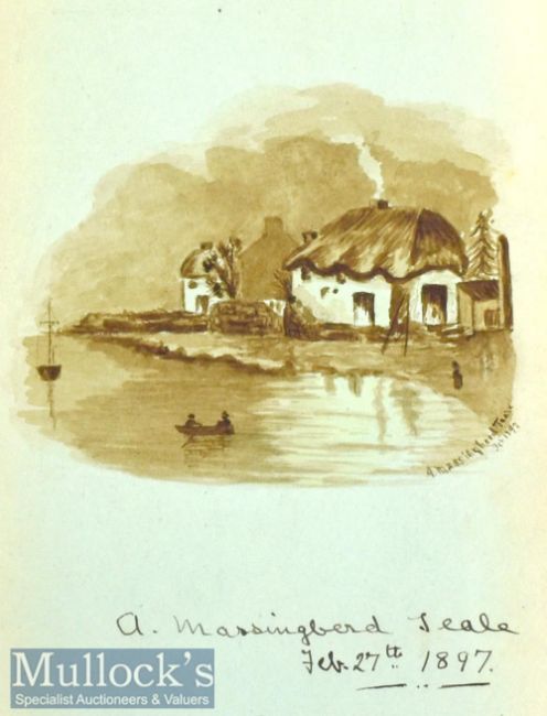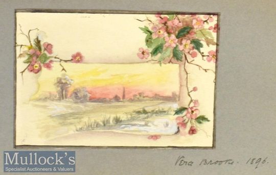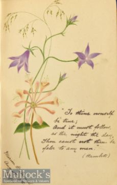 Victorian Sketch Album with 18 attractive well done Water Colour paintings, plus some pencil sketches, entry dates 1891 to 1903, and lines of verse and poetry by herself and her friends, mostly in English, but some in French and German. Was property of a Miss Sibyl Cooper who probably lived at Torquay, but she certainly travelled as entries range from Tunbridge Wells to Johannesburg and Wiesbaden. In red leather, size, 5” × 8¼”.