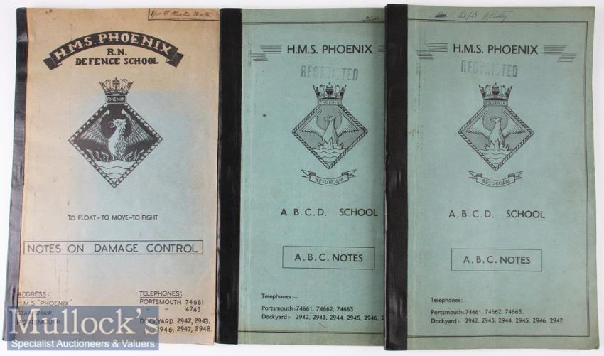 1950s HMS Phoenix Notes Books (3) R.N. Defence School Notes on Damage Control and 2x ABCD School ABC Notes books.