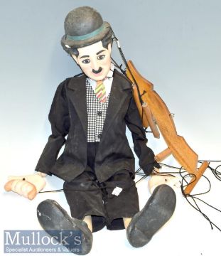 Charlie Chaplin Wood and Plaster Marionette in traditional black suit, waistcoat and tie with wooden limbs and plaster head, hands and feet, measures 65cm approx. in length, right hand appears loose, otherwise in good condition overall