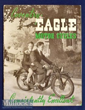 Coventry Eagle Motor Cycles 1939 Sales Catalogue A 16 page catalogue illustrating and detailing their range of 7 machines from a 125cc Cadet for £25.10s to a 496cc Flying Eagle for £62 Guineas. All made at their Bishopsgate Green works in Coventry. Size 7¼” × 9¼”.
