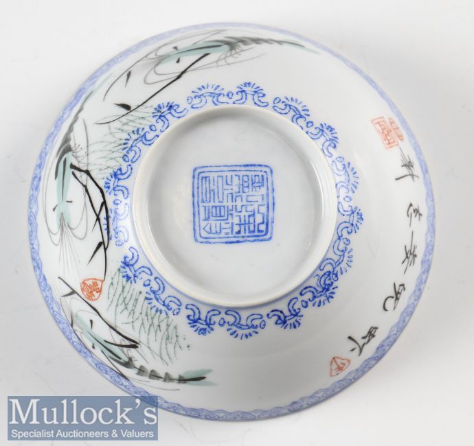 20th century Chinese Porcelain Bird Feeder with enamelled figural design with openings to front and rear, top A/F, unmarked, height 13cm, together with a Chinese egg shell porcelain bowl with insect and character design, with four character blue mark to base, dia. 18.5cm. (2)