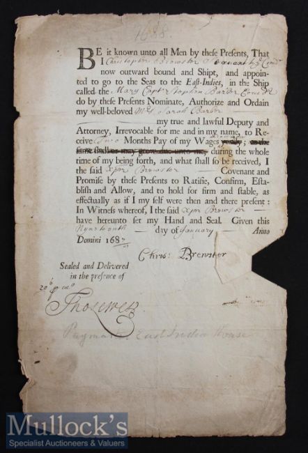 India – Very Scarce Early East India Company. Historical Document 19th January 1687 - Power of Attorney - Handsigned by the Paymaster of The East India Company at East India House named “Thomas West”. Black printing with manuscript annotations and signatures, this Power of Attorney assigning one Christopher Brewster’s wages to Mrs. Sarah Barber. He sailing on ship called The “Mary” under Captain Stephen Barber, Commander (probably Commander of the Fleet of Ships sailing to India that year). Size 7¾” × 12”.