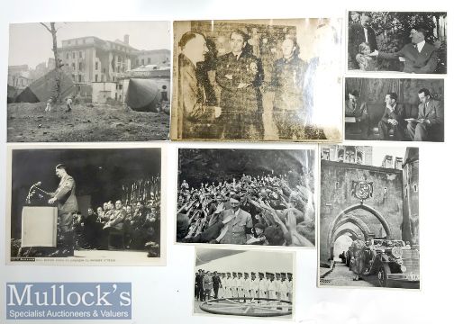 WWII Adolf Hitler Photographs including a selection of press photographs depicting Hitler’s demolished Reich Chancellery, a Radio picture from Stockholm 9/1/45, Hitler giving a speech blank to reverse, plus a selection of smaller ‘Sammelwerk’ prints (84)
