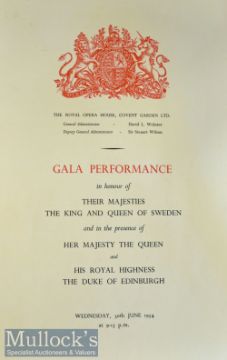 Royal Opera Performance In Presence Of The Queen & King & Queen Of Sweden. Covent Garden 1954 Programme A large impressive special Royal programme of Opera Le Coq d’Or by Rimsky-Korsakov. A 4 page programme in gold and blue card cover with deckled edge and tied with silk cord, size 10½” × 15½”.