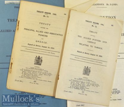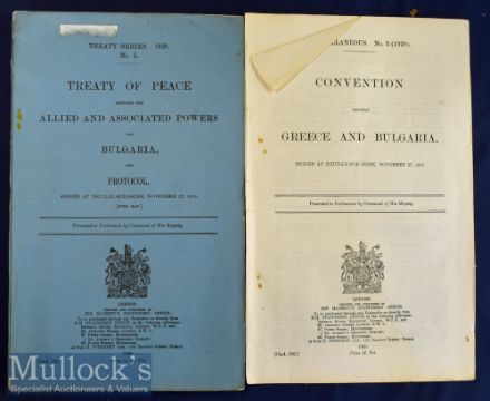 WWI United Kingdom Government Document – Treaty of Peace Bulgaria 27 Nov 1919 with large folding map showing redefined borders 37x26” approx. along with convention between Greece and Bulgaria 1919, treaty between allied powers and Greece relative to the thrace 1920 and one other, scuffed with staple rust marks (4)