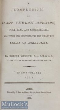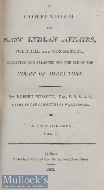 India - A Compendium Of East Indian Affairs - Political And Commercial, Collected And Arranged For The Use Of The Court Of Directors (for The East India Company) by Robert Wissett 1802 - In two volumes complete as called for. The first volume giving the revenues of Bengal, Bombay and Fort St. George (Southern India) and other places. Indian Debt and Interest, Dividends. Charters and Constitution of The East India Company etc. The second volume giving Accounts description and values of goods Exported to India. Accounts, descriptions and value of goods Imported from India, Also Shipping Rates, Tonnage and charges etc etc, With original leather Board covers, but spines expensively rebound in quality leather. Each size 4¾” × 7¼” (2)