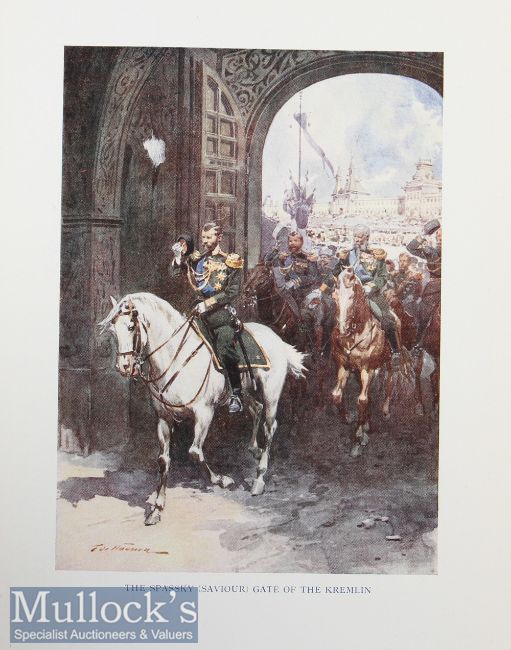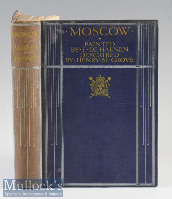 Moscow - by H M Grove Painted by F de Haenen 1912 Book First Edition an attractive 142 page book with 16 Multi-coloured Plates and 16 Black / White plates. Plus fold out map of Moscow. Has interesting charters regarding the City and its people. In blue cloth board binding with Czarist Arms on front cover, size 6½” × 9”.