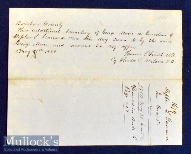 Slavery - Hire Of Two Slaves Receipt, Bourbon County, Kentucky 1850 Manuscript document with signature of George Moore regarding hiring 2 slaves named Pleasant & Milly and other details relating to the Plantation. Size 7¾” × 6”