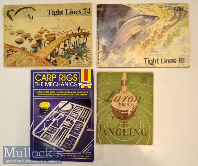 2x Abu Tackle Catalogues et al(4): Abu “Tight Lines” for 1974 and 1981 in the original wrappers; ICI “Luron For Angling” in the original wrappers c/w illustrated knots et al wrappers stained and marked hence (AF); and Steve Broad – “Carp Rigs – The Mechanics” 2nd ed 2015 in original wrappers (F/G) – all with Retailers’ Tackle Traders Stamp marks