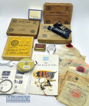Hardy Bros Alnwick fly and lure card boxes (4) plus The Drifly Dresser tool a Hardy gilt vesta case, another Hardy carded box, Hardy book of flies, plus a selection of cast envelopes, modern leaders etc (Qty)