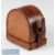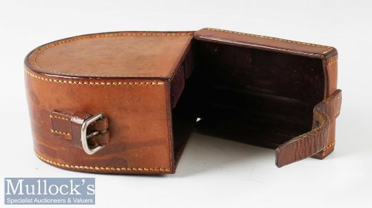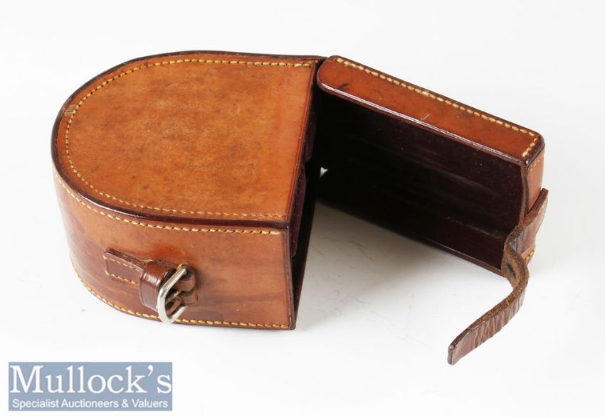 Leather D block reel case appears unnamed internally measures 3.25” length, 1.25” width, some staining, otherwise in good condition, dark lining