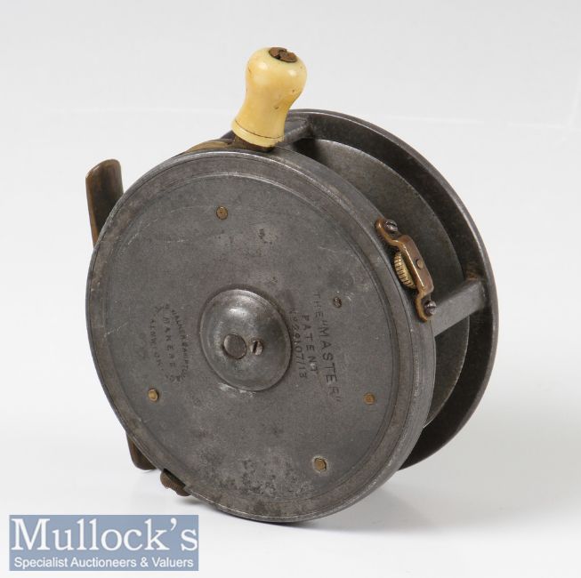 J J S Walker Bampton & Co Alnwick 3 ½” ‘The Master’ patent alloy bait casting reel Silex style, marked Patent 29107/13 with maker’s oval mark to back, twin handle, strapped rim tensioner, rim brake lever, quick release spool, interesting silent check mechanism marked 85 internally, runs smooth, some corrosion to rim in places