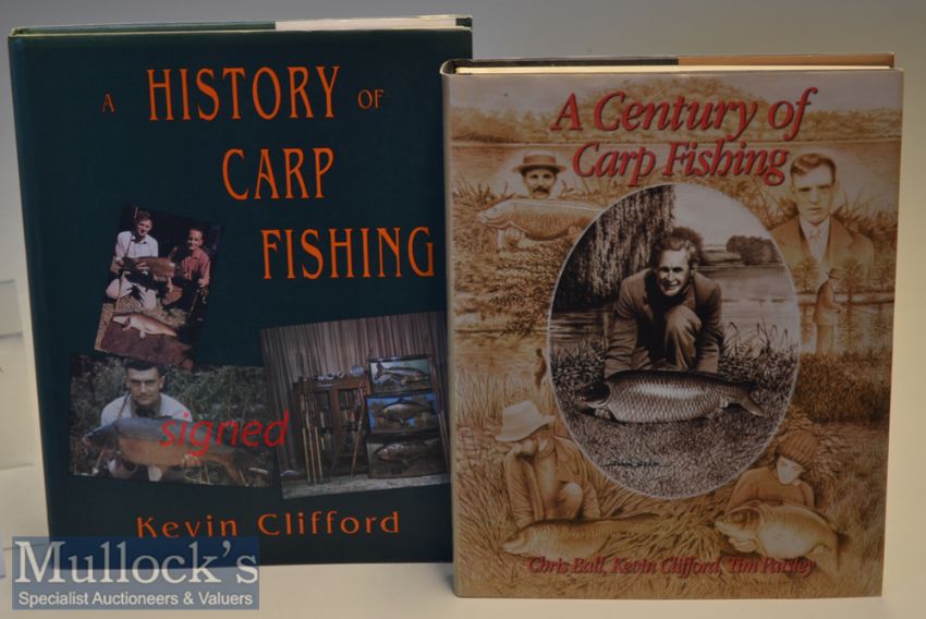 2x Carp Fishing Books signed – Clifford, Kevin signed – “A History of Carp Fishing” 1st ed 1992 – illustrations c/w dust jacket and signed and dated by the author to the front free end plate comes with Erratum leaflet (VG); Chris Ball, Kevin Clifford, Tim Paisley - “A Century of Carp Fishing” 1st edition 2000 signed by Chris Paul to the main title page with dedication - numerous illustrations throughout comes in the original dust jacket (VG)