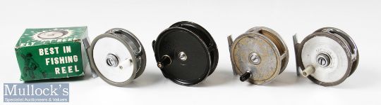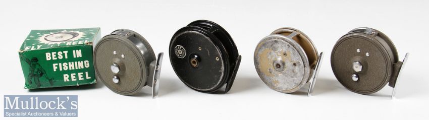 Various fly reels to include a single action 3” fly reel marked Japan to foot in box appears unused, another model with signs of use, plus a ‘The Panton’ 3” fly reel and an Allcocks3 ½” Popular fly reel – signs of use apparent, otherwise G overall (4)