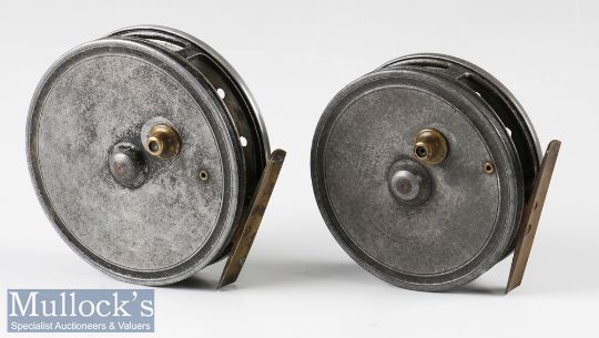 S Allcock & Co 3 ½” ‘Perfection Flick-Em’ alloy centre pin reel narrow drum, stag logo, twin handle, smooth brass foot, together with a A W Gamage ‘Flick-Em’ centre pin reel both with signs of surface wear, run and spin very well (2)