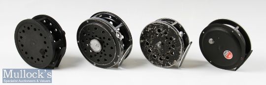 4x various fly reels to include Bob Church The New Lineshooter nylon 3 7/8” trout fly reel appears unused, plus DAM Quickfly 90 3 7/8” fly reel, a two others marked Made in Japan measuring 4 ¼” and 3 1/2” signs of surface wear