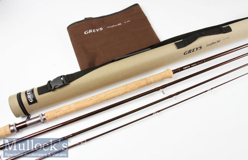 Salmon Fly Rod: Greys Alnwick Greyflex Carbon fly rod – 15ft 4pc line 10# - with 2x Fuji style lined butt guides – very lightly used cork handle with anodised screw locking winch fittings-complete with maker’s matching brown cloth bag and the original maker’s cordura rod tube (G)