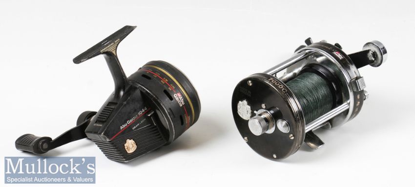 ABU Ambassadeur 7000C multiplier reel in black and chrome construction, level wind, tamped 81-2 87-88 to foot, signs of surface wear, otherwise spins well overall together with a Abu Garcia 1044 closed face reel appears good overall (2)