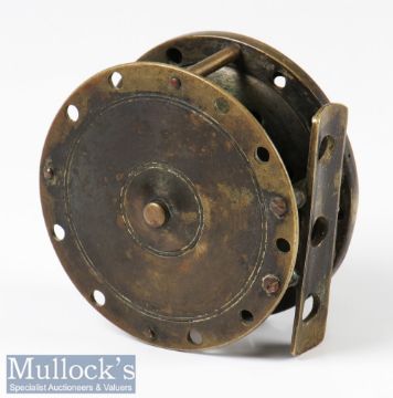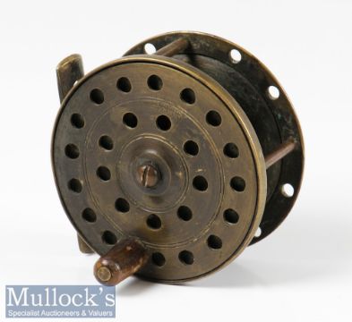 Interesting 2 7/8” all brass fly reel marked ‘Expressly Made in England Banerjee & Co’ to the perforated face, five pillar construction, perforated foot, constant check, seems to run well