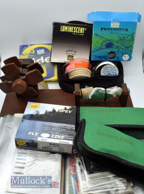 Wooden Line Feeder and Line Selection – unnamed with fixed reel mount for winding, with a selection of mixed fishing line, some in boxes including Orvis, Spey, Shakespeare and others (qty)