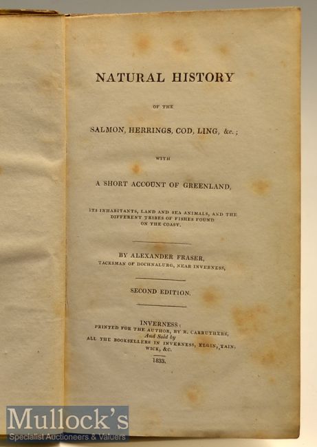 Early 19th c Fishing Book: Fraser, Alexander-“Natural History of The Salmon, Herrings, Coloured, Ling; With A Short Account of Greenland, its inhabitants, land and sea animals, and The Different Tribes of Fishes Found on The Coast” 2nd edition 1833 printed for the author by our Carruthers Inverness-original yellow and green paper covered boards, paper title - label on spine – the original 1st ed was printed for distribution only among the author's friends, and consequently was limited to a small impression – the author added to this edition a short account of the Greenland Fisheries – some speckle foxing, edges slightly tinged otherwise clean – boards dust stained