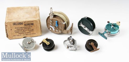 5x Various centre pin fishing reels incl’ a Paramount 3 ½” bakelite reel, a Brevete S.G.D.G 2 ¼” reel with plastic spool, a Silver Ship Oriental Reel 2 ¼” reel, 2x 2 ¼” bakelite reels, plus a French Super-Lex Modele Depose side casting reel and a Grice & Young Orlando Supreme casting reel in box (7)