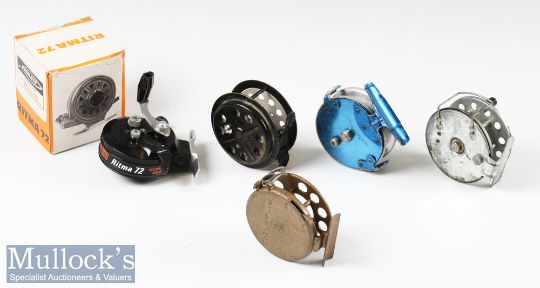 5x Various fishing reels to include Peerless 2 ¾” centrepin with loose handles, plus a Peerless Ritma 72 made in France, plus a Pflueger Progress 2 7/8” fly reel a the ‘Wey’ mark I centre pin reel 2 ½” and an unnamed 2 ¾” centre pin reel all with signs of wear