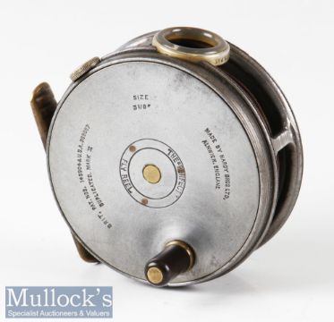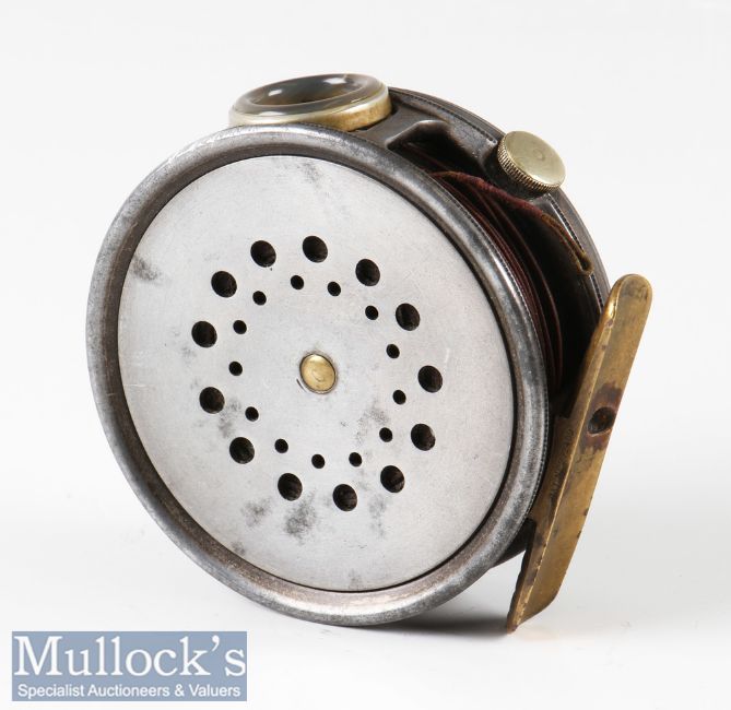 Hardy Bros England 3 1/8” perfect Dup Mk II alloy trout fly reel with green agate line guide (hairline crack) ribbed brass foot 272409, line wear to rim and pillar, otherwise runs smooth