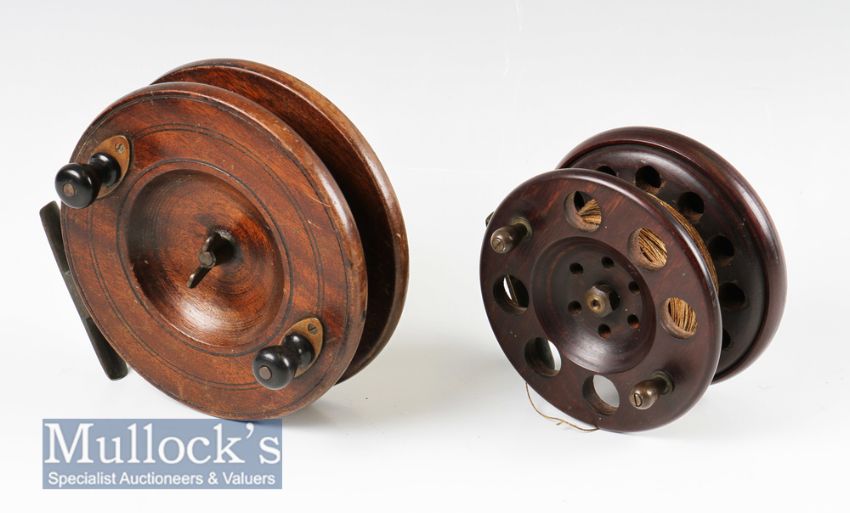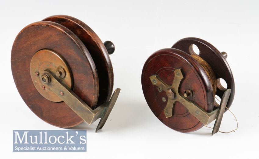 Wood and brass Nottingham 6” centre pin reel with on/off check, wing nut to centre, plus a 4 ¾” wood and brass star back reel with a perforated drum, small notch out of rear plate, both spin well (2)