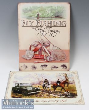 Modern fishing and country pursuits advertising signs to include Hardy Brother, Fly Fishing, Fishing The Way to a Man’s heart is through his Fly!, James Purdey & Sons, The Gamekeeper, and Walking the dog Country Style, all measuring 40x30cm approx, with holes at edges, ready to hang (6)