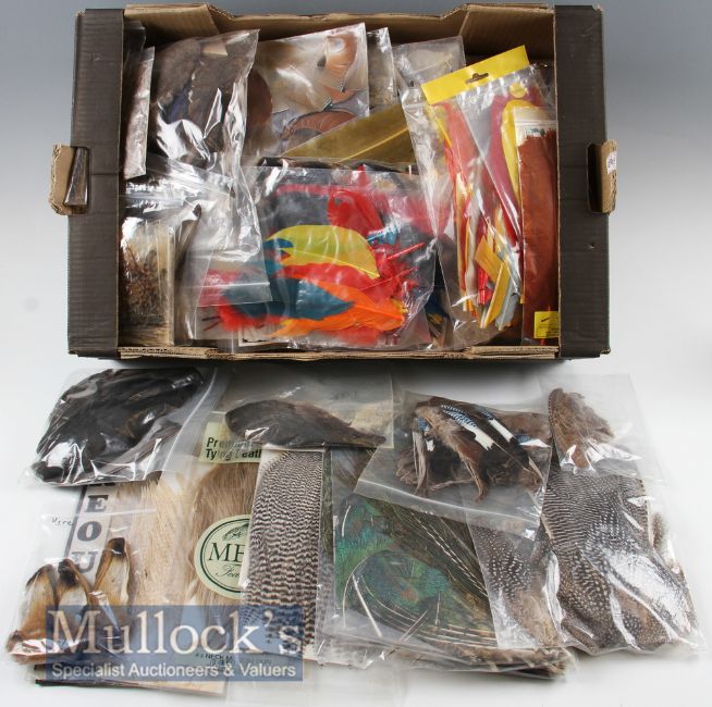 Large Quantity of Fly Tying Feathers and Materials incl deer hair, partridge, peacock, goose, mallard, hare ears, mixed capes, mostly in unbranded bags with some Metz and Veniards (qty) box