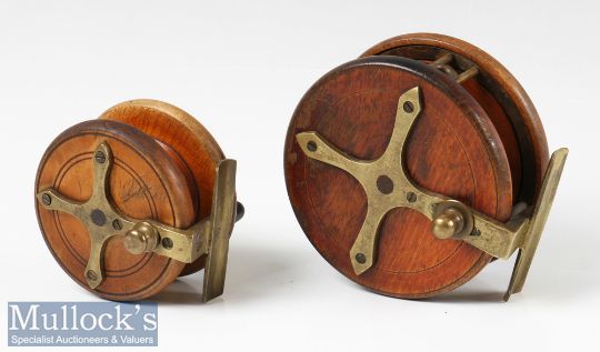 2x Wood and brass centre pin reels measuring 4” reel with alloy rear flange, twin handles, line guide, strap brass back, plus a 3” reel with brass star back twin handles runs smooth
